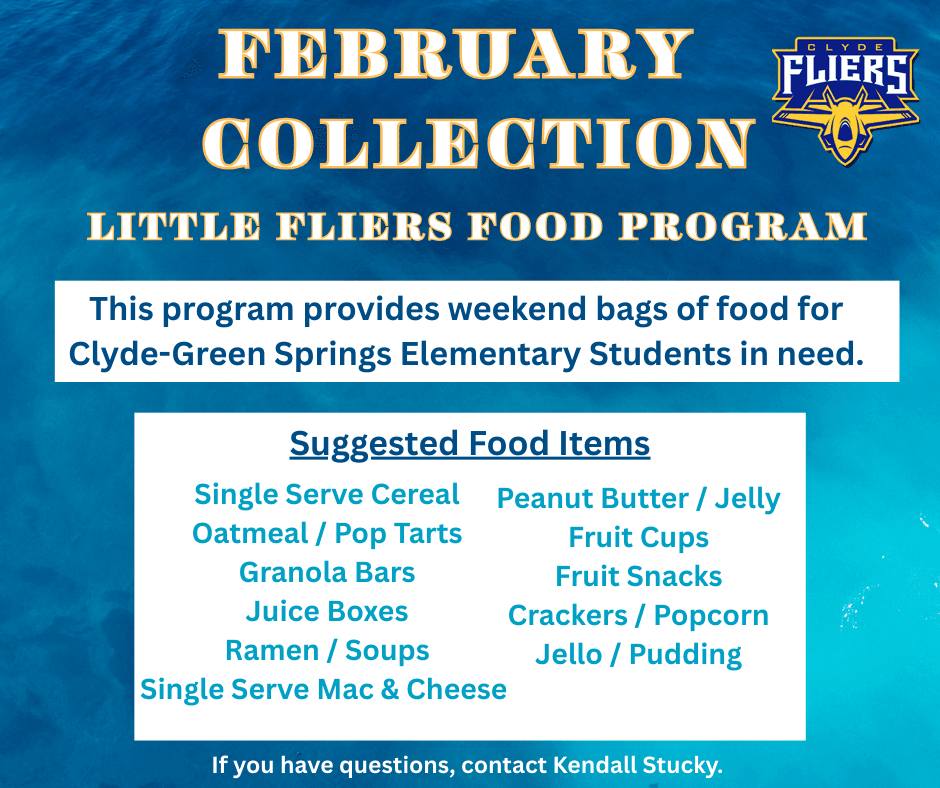 Throughout the month of February, we will be collecting donations for the Little Fliers Food Program. This program provides weekend food bags—two breakfasts, two lunches, and two snacks—for Clyde–Green Springs Elementary students in need. Donations may be placed in the collection box by the back door near the elevator or in the sanctuary.